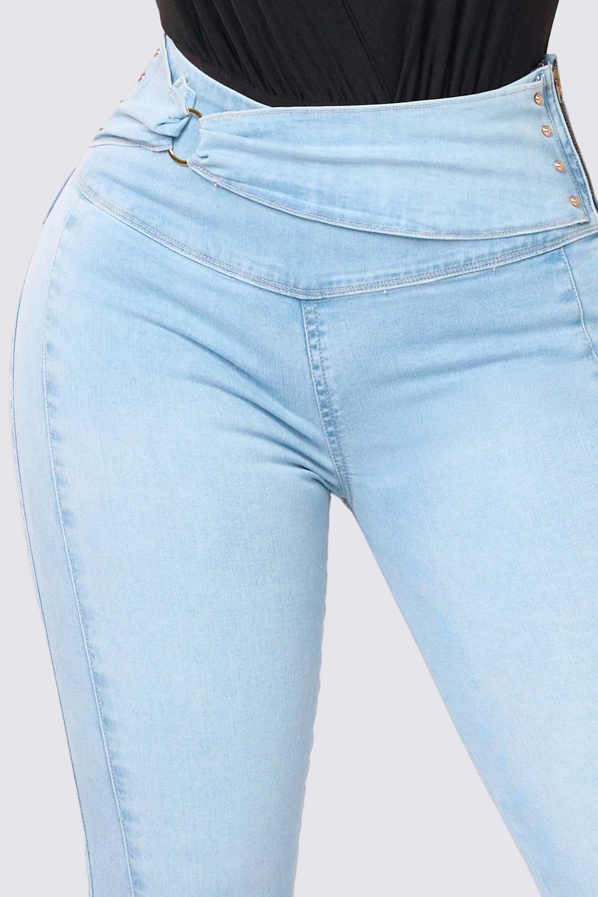 High-waisted jeans with a crossover waistband detail and side closure that slims the waist and enhances the hips. The light stretch denim shapes the figure without compromising comfort. Decorative button detail on the bootleg for a modern, feminine touch. Ideal for fresh, eye-catching looks.