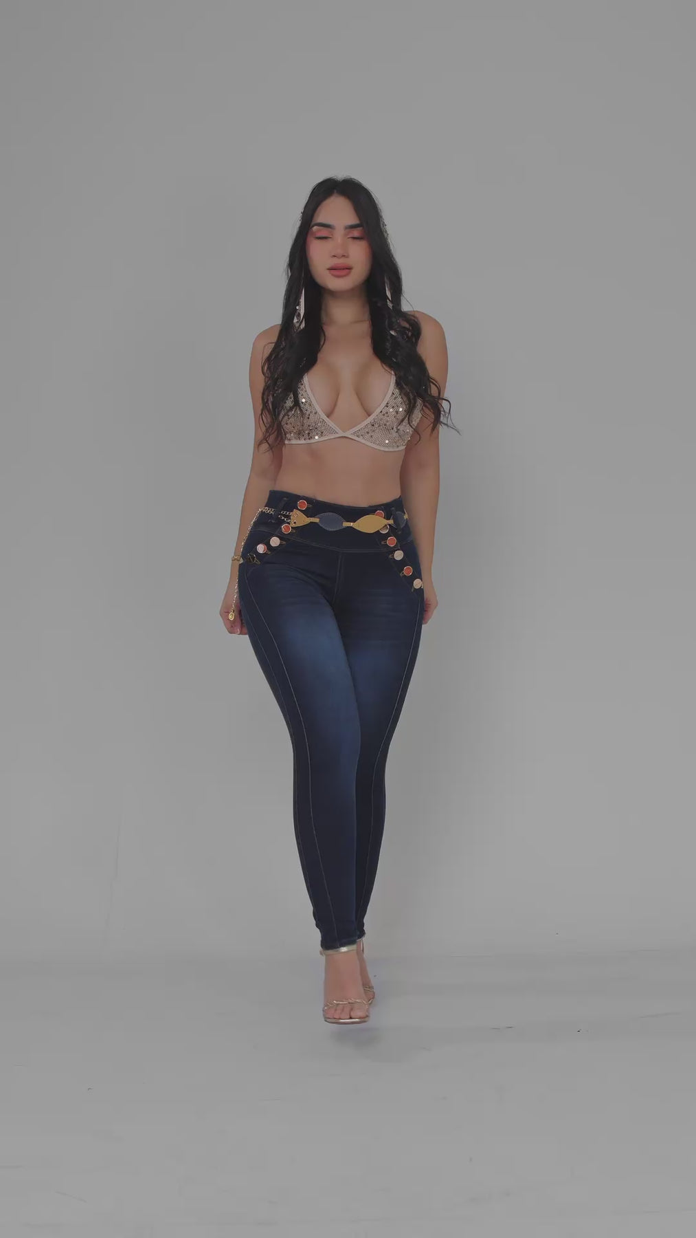 These high-waisted skinny jeans in dark blue denim combine elegance and attitude. Their slim fit flatters the figure and slims the legs, while the decorative belt with gold metal appliqués adds a sophisticated, modern touch.