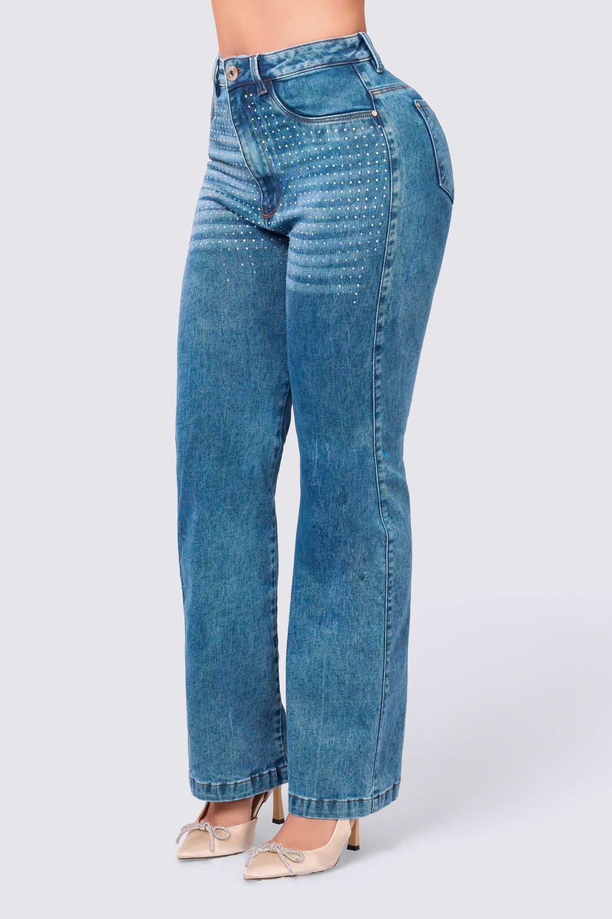 These straight-leg, high-waisted jeans in medium blue denim combine classic style with modern details. On the front, horizontal rhinestone appliqués add a luminous and sophisticated effect, highlighting the hip area with a subtle and glamorous shine. Their straight cut slims and elongates the figure, while the back pockets maintain the practical and versatile feel of the design. A trendy garment that combines the strength of denim with the charm of sparkling details.