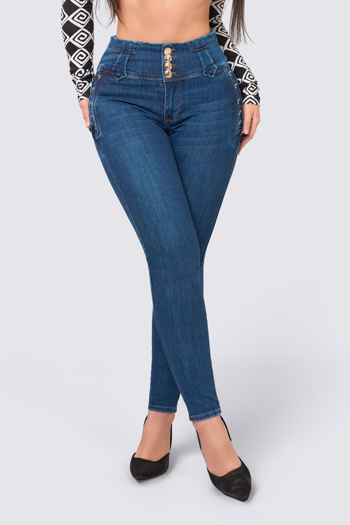 Elevate your style with these dark blue high-waisted skinny jeans, designed to enhance your figure with a slim, flattering fit. Their wide waistband with gold metal buttons adds a sophisticated, modern touch, while the sides with eyelets and crisscross laces add an avant-garde, sensual detail that makes all the difference.