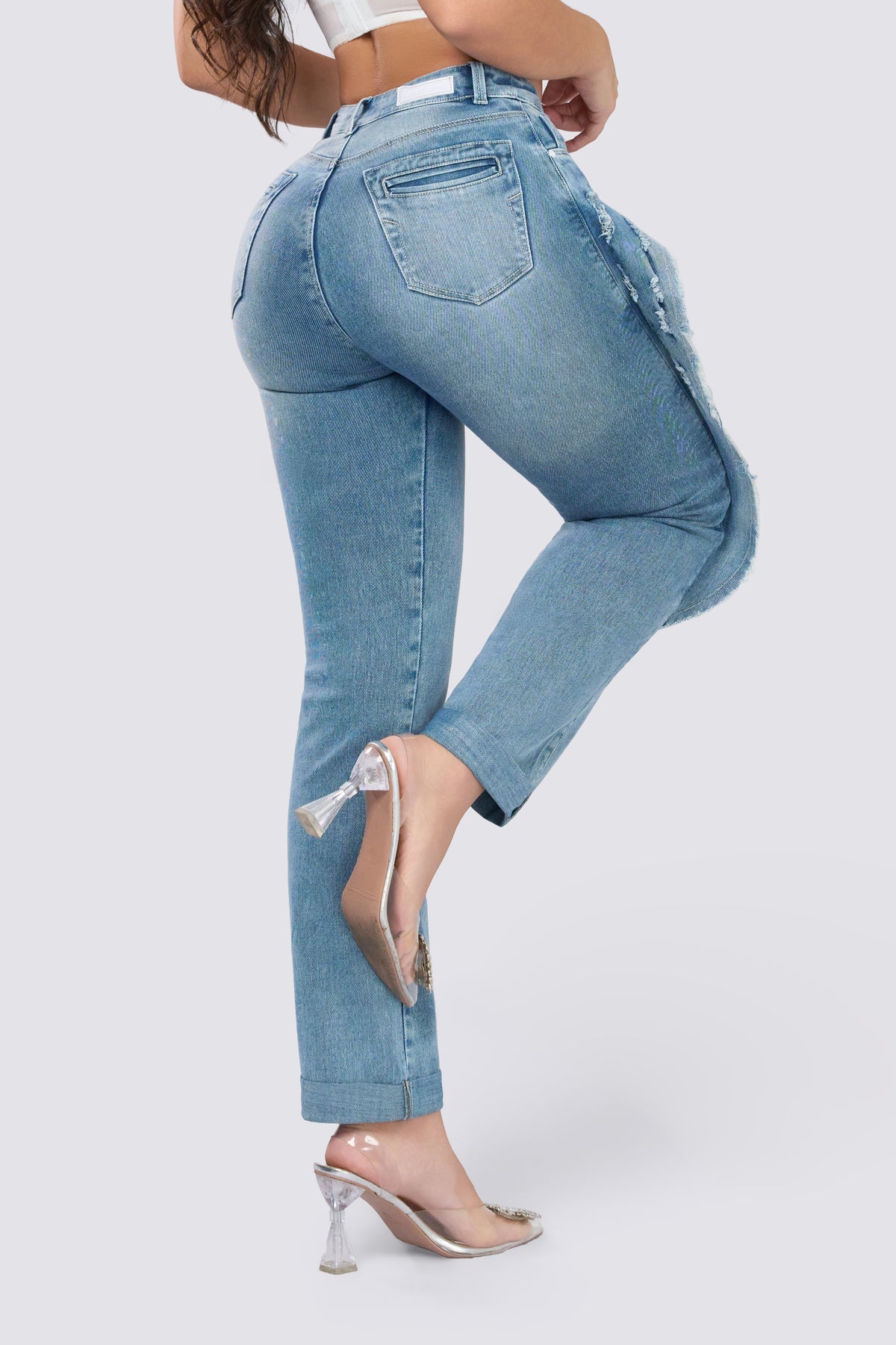 They feature a five-button front closure that slims the abdomen and frayed side panels that add a unique, modern design. Their medium blue wash with a lightened effect visually lengthens the legs.