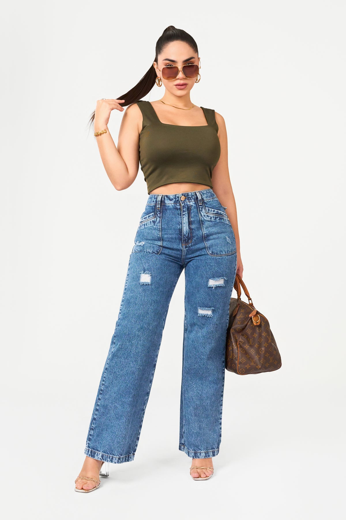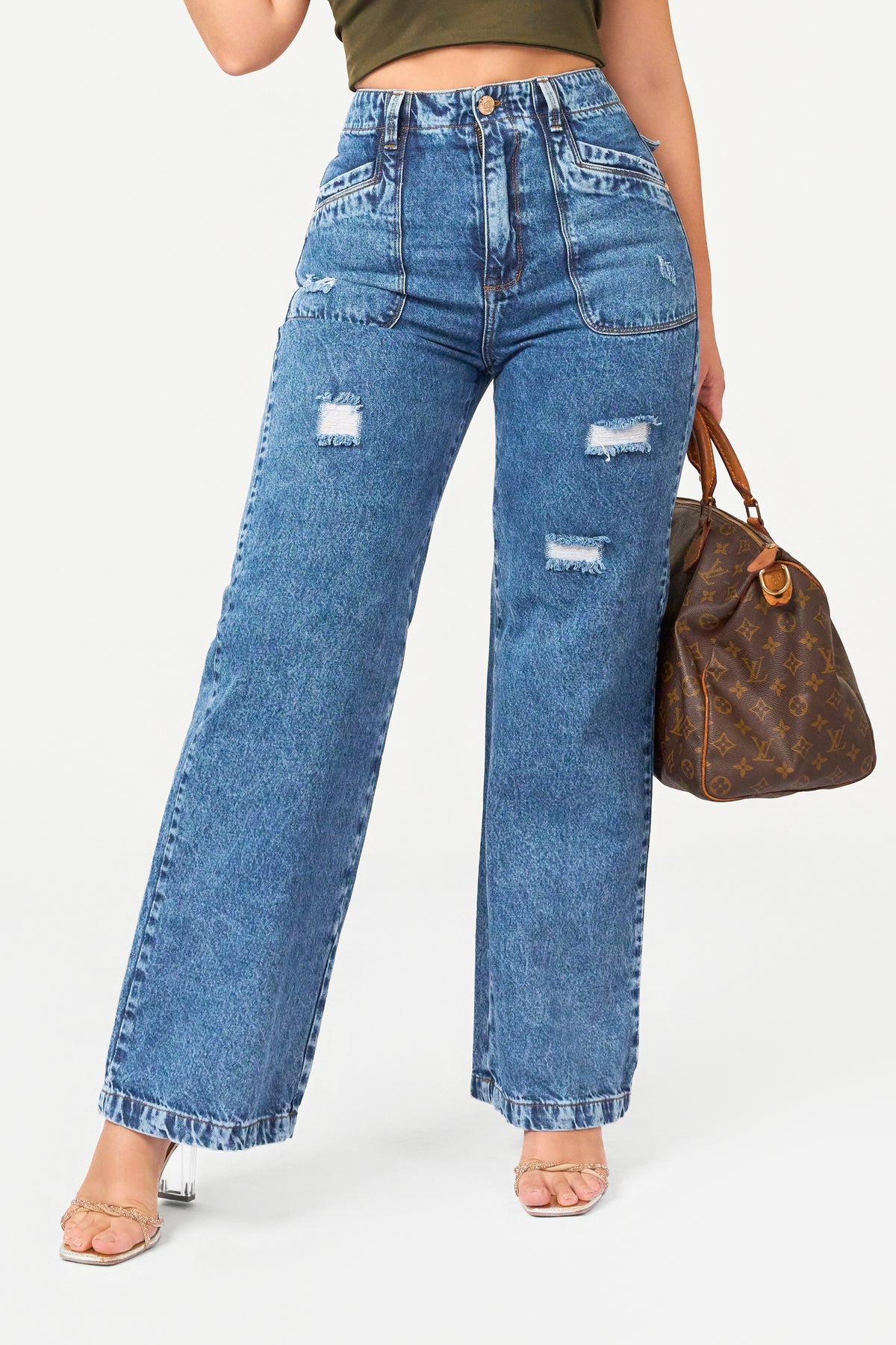 These high-waisted wide-leg jeans combine the comfort of classic denim with the refinement of modern finishes. Their wide silhouette falls elegantly, while localized wear and faded effects add texture and a casual feel without losing sophistication.