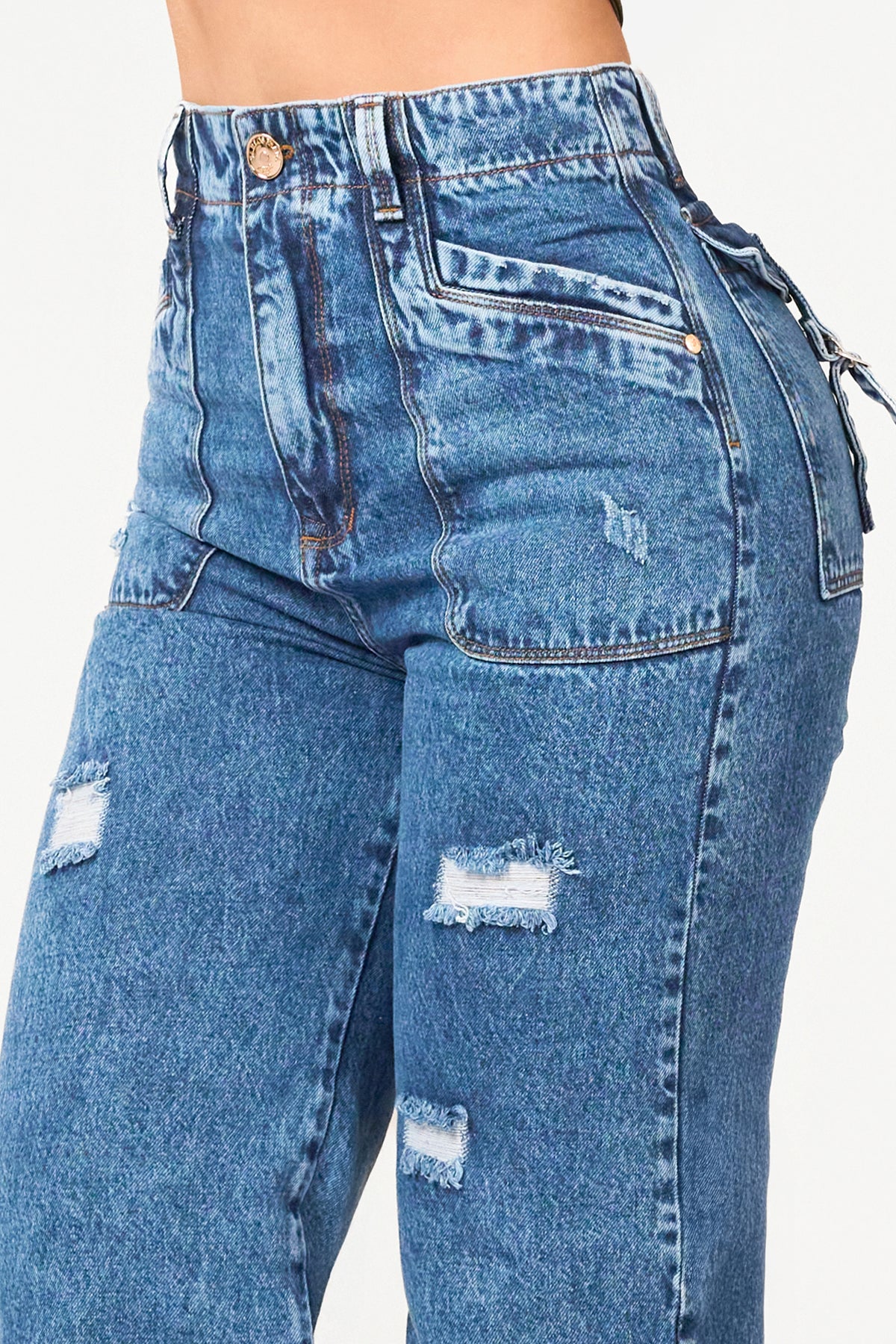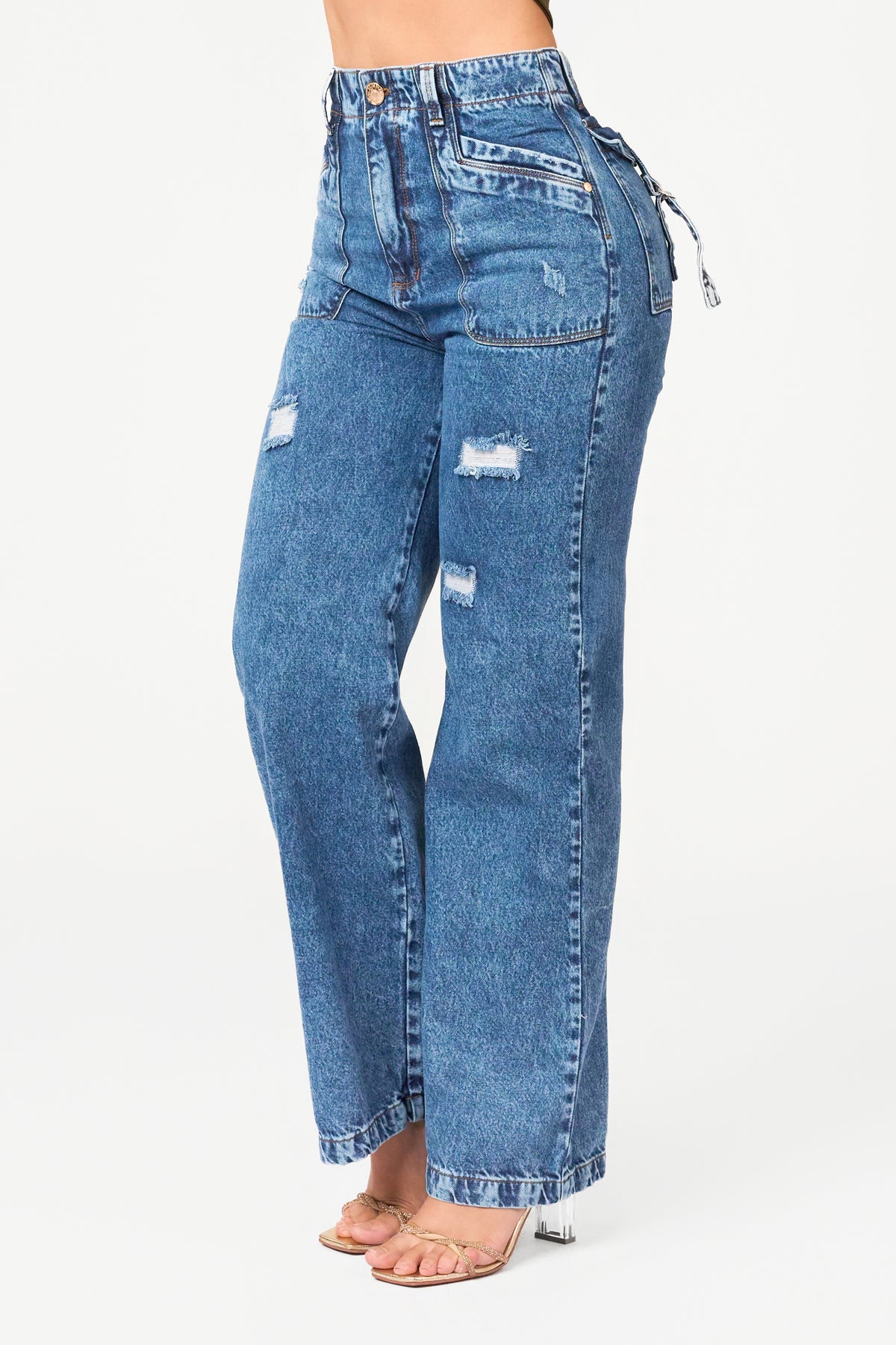 Blue wide-leg pants with a thin waistband with a single button and distressed detailing on the front.